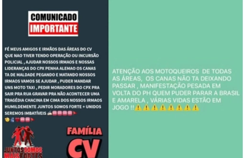 Ontem eles obrigaram moradores a irem para o meio da rua para servir como escudos durante fuga e troca de tiros com a polícia. Veja mensagens atribuídas aos narcoterroristas do Comando Vermelho: