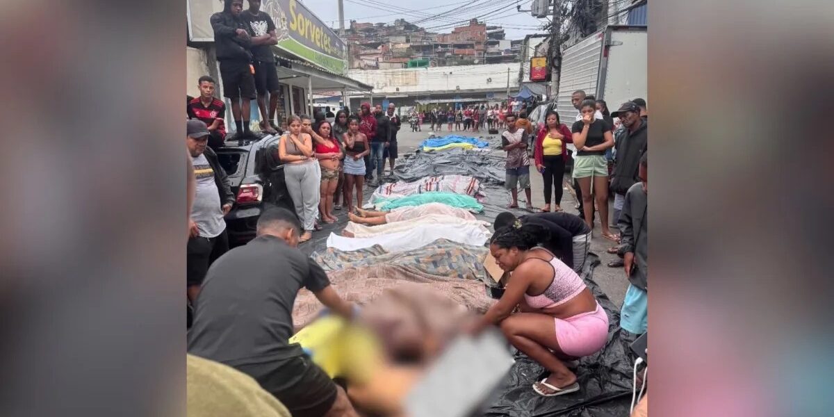 A Praça da Penha, na zona Norte do Rio de Janeiro, amanheceu com uma fila de corpos estendidos em uma lona na manhã desta quarta-feira (29).