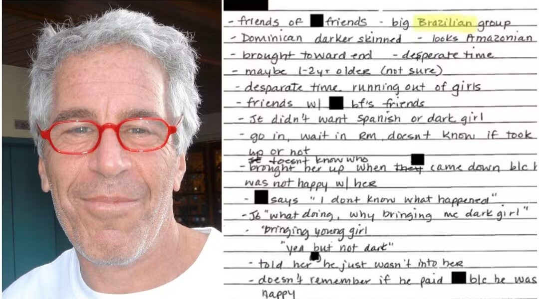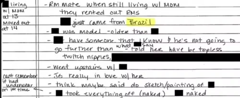 Um trecho das anotações diz que Epstein não queria “spanish or dark girls”, ao mesmo tempo em que se interessava por determinadas modelos, incluindo uma que teria “acabado de vir do Brasil”, por quem estaria “realmente apaixonado” e sobre a qual teria falado em fazer um esboço ou pintura.[3] O depoimento cita ainda que Epstein pedia documentos de identidade para conferir se as meninas tinham menos de 18 anos, pois desconfiava das idades informadas, revelando uma busca deliberada por menores de idade.