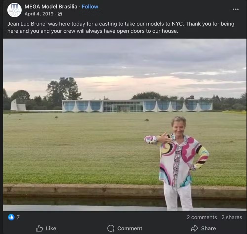 Em uma publicação de 2019, a Mega Model Brasília divulgou imagem e vídeos de Brunel em seu espaço, com a legenda de que ele “esteve aqui hoje para um casting para levar os nossos modelos para Nova Iorque”, e que ele e a equipe “sempre serão bem‑vindos à nossa casa”.