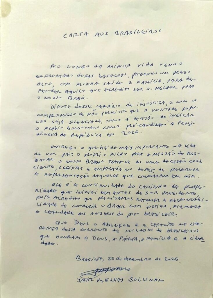 “Ao longo da minha vida tenho enfrentado duras batalhas, pagando um preço alto, com minha saúde e família, para defender aquilo que acredito ser o melhor para o nosso Brasil”, inicia Bolsonaro na carta, que foi lida por Flávio para jornalistas. “Diante desse cenário de injustiça, e com o compromisso de não permitir que a vontade popular seja silenciada, tomo a decisão de indicar o Flávio Bolsonaro como pré-candidato à Presidência da República em 2026”, segue ele.