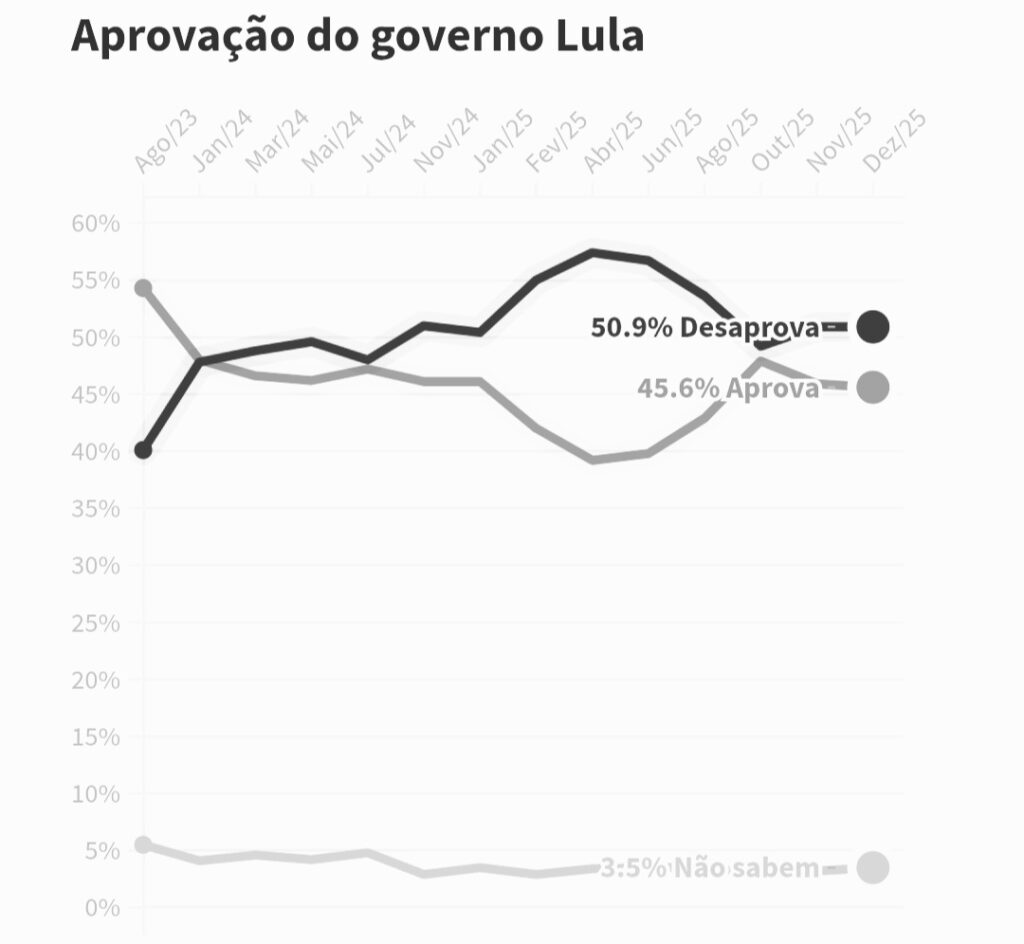 Entre outubro e novembro de 2025, a aprovação do governo Lula pelo Paraná Pesquisas caiu de 47,9% para 45,9%, enquanto a desaprovação subiu de 49,2% para 50,9%.