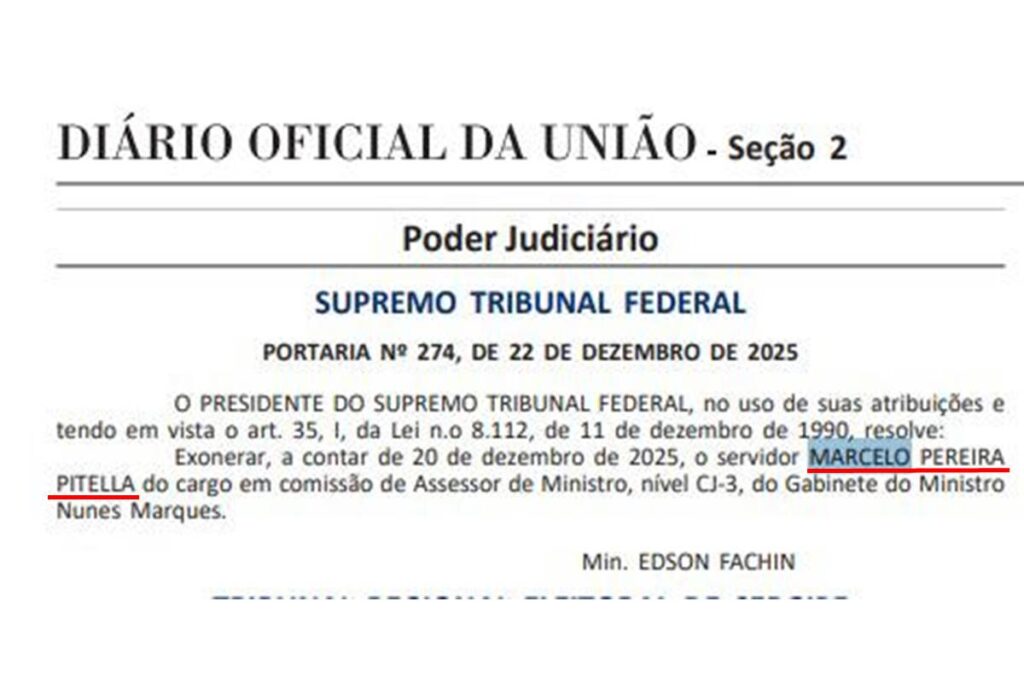Pitella era lotado no gabinete do ministro Nunes Marques até 22 de dezembro, dois dias após a prisão, quando perdeu o cargo em comissão no gabinete.