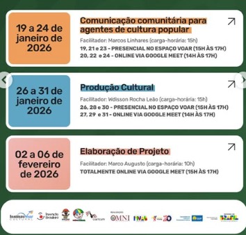 O Pontão Popular e Periférico Voar, com sede no Gama, abriu inscrições para três oficinas gratuitas voltadas à formação de jovens agentes de cultura popular, com atividades presenciais e online entre janeiro e fevereiro de 2026. A iniciativa, voltada a quem tem de 15 a 29 anos, integra o programa Formação de Jovens Agentes Cultura Viva e pretende preparar uma nova geração de articuladores culturais nas periferias do Distrito Federal.