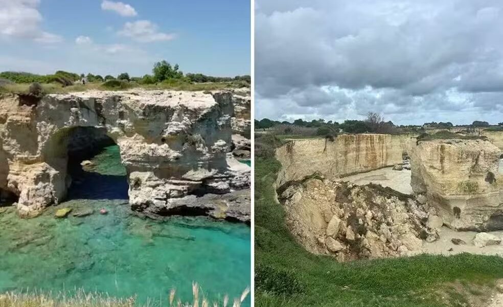 O Salento, “calcanhar” da bota italiana, perde mais um símbolo natural, reacendendo debates sobre preservação costeira em meio a eventos climáticos intensos.