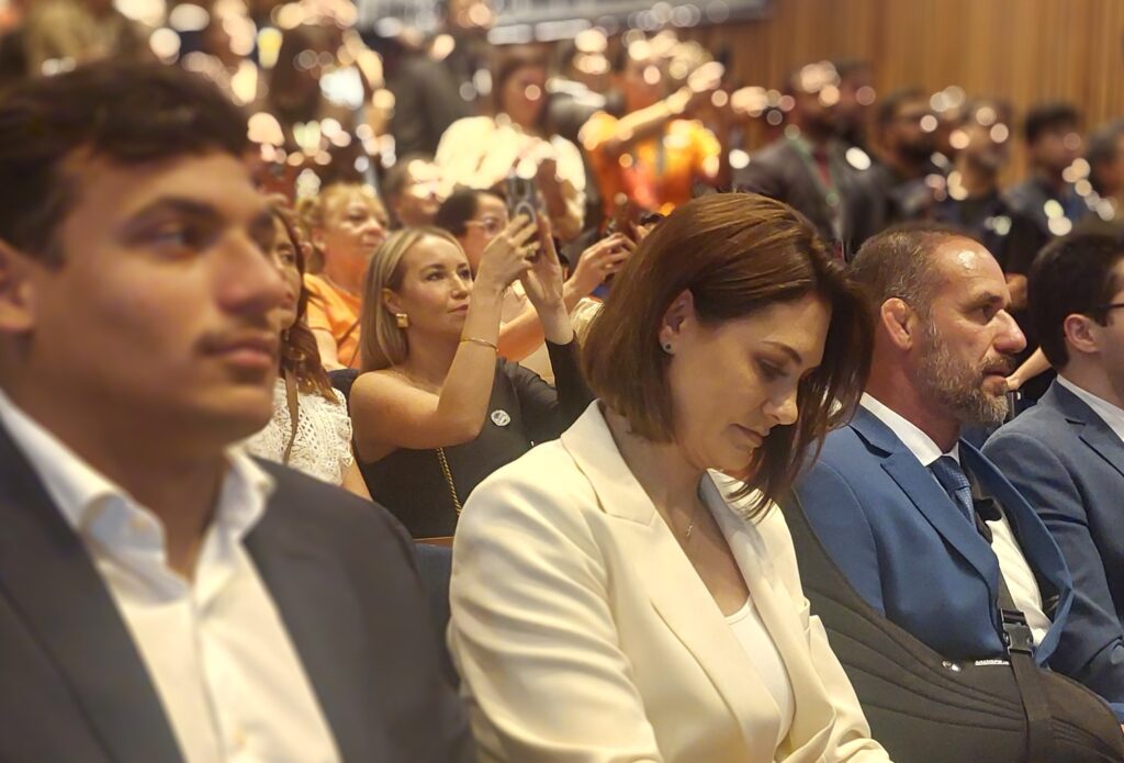 No auditório, familiares e amigos, entre eles os pais de Celina, Abrão e Maria Célia, o marido Fabrício e amigos como Michelle Bolsonaro.