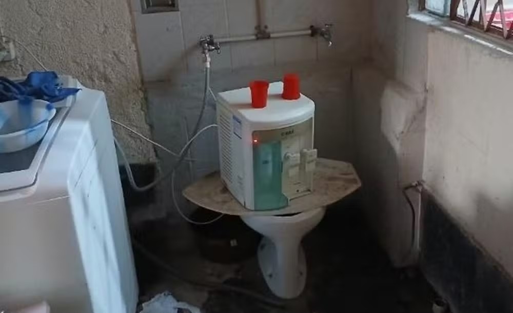 Em um dos locais, o bebedouro estava apoiado sobre um vaso sanitário.